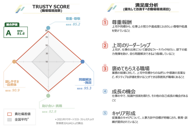 ストレスチェックの各設問の回答結果から、ドクタートラストが定める職場環境指数(TRUSTY SCORE)の偏差値が算定され、信頼関係が強く生産性の高い職場であるかどうかが評価されました。その結果、当社は算定4領域(1.尊重・尊敬 2.問題解決・挽回 3.助け合い・挑戦 4.話しやすさ・自然体)の全てで偏差値80以上を記録し、総合偏差値91.6と評価されました。(全国平均偏差値:50)