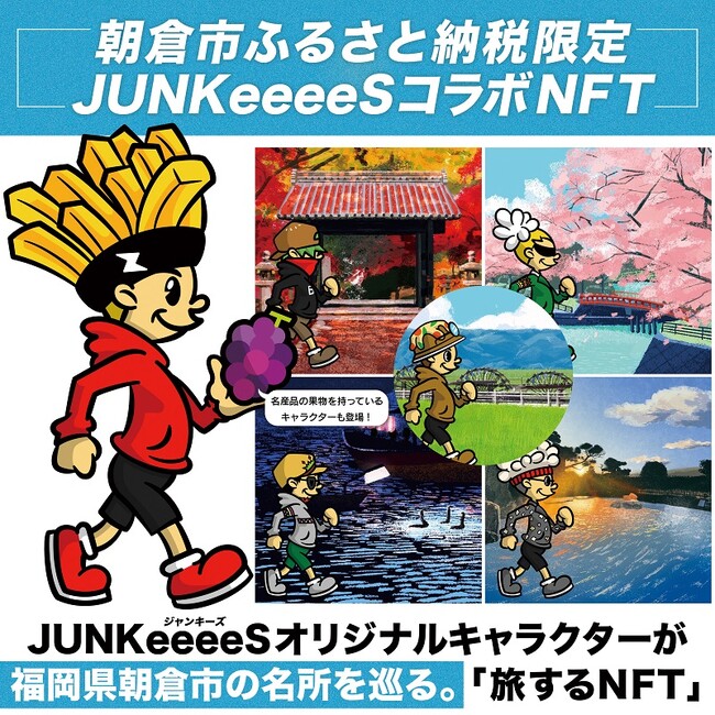 朝倉市の名所をJUNKeeeeSのキャラクターが巡るすべて1点もののNFTアートを100枚限定で返礼品に。