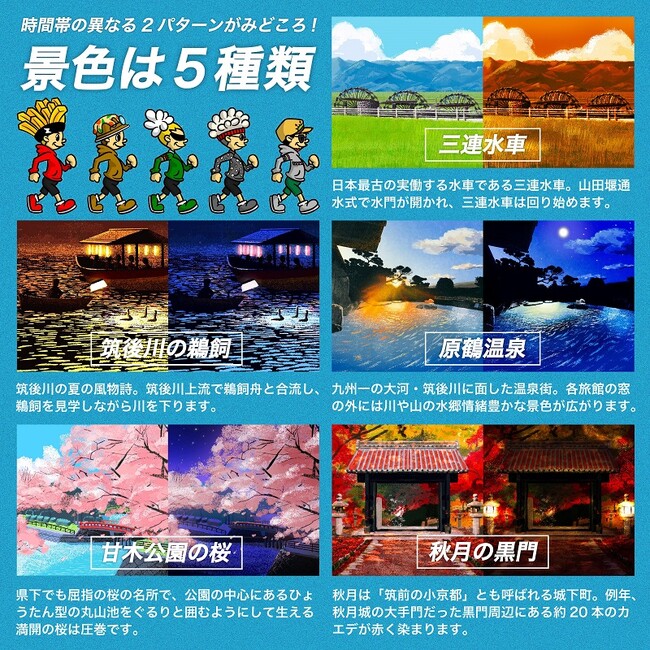 本返礼品には返礼品そのものとしての価値に加え、NFTアートという新たなツールで朝倉市の魅力を発信する狙いがあります。「朝倉市×JUNKeeeeS(ジャンキーズ)コラボ 旅するNFT」では、JUNKeeeeSの6人の人気キャラクターが朝倉市の名所5か所を巡り、時間帯の異なる景色の中を旅します。登場するキャラクターは、ポテトヘッド・ピッツァハット・バクガホップ・ポップコーン・タコスボーイ・BLTで、中には朝倉市の名産品を持っているキャラクターも登場します。旅する名所は、三連水車、秋月の黒門、筑後川の鵜飼、甘木公園の桜、原鶴温泉です。限定100枚の制作で、キャラクターや名所、名産品などがすべて異なる組合せになっており、朝倉市をテーマにJUNKeeeeSリードデザイナーのエース氏と同じくJUNKeeeeSデザイナーのたそちゃん氏が描き下ろした、すべて1点もののイラストとなります。中には、朝倉市限定のシークレットキャラも登場予定で、どのような組合せが届くかはランダムなので、届くまでお楽しみです。