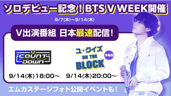9月14日(木)に、V(BTS)がソロでゲスト出演し話題を集めたバラエティ「ユ・クイズ ON THE BLOCK」の出演パートの日本語字幕版を最速配信します。さらに、人気音楽番組「M COUNTDOWN」の出演も決まり、日韓同時配信でお届けします。