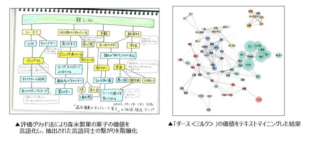 本研究では、「ダース」の価値を明確化するために、人間中心設計(Human-centered Design)やユーザーエクスペリエンスデザイン(User Experience Design)で用いられている評価グリッド法やシナリオ手法等を組み合わせて用いました。評価グリッド法では、「ダース」を含む様々な森永製菓のチョコレート菓子を比較分析することで、森永製菓のチョコレート菓子の価値に関するキーワードを構造的に整理しました。次に、これらのキーワードを用いて森永製菓のチョコレート菓子の価値に関する文章を作成し、具体的なキーワードから上位の抽象的なキーワードへ繋げる価値シナリオ(森永製菓のチョコレート菓子の魅力を表す文章)として具体化しました。さらに40名弱の学生がこれらの価値シナリオに対して、「ダース」の価値として共感できるかどうかを5段階で評定して、平均4.0以上の値が得られたものを「ダース」の価値シナリオとしました。その後、「ダース<ミルク>」と競合商品との比較分析を通じてさらにブラッシュアップ。これらのプロセスから得られた「ダース<ミルク>」の価値シナリオをKH Coderによりテキストマイニングすることで、「ダース<ミルク>」の価値を共起ネットワークとして表現しています。