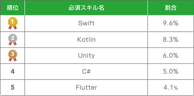 求められるスキルは、Swift、Kotlin、Unity、C#、Flutter