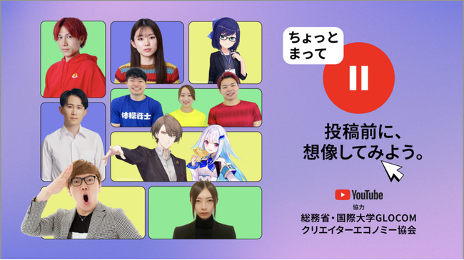 「ちょっとまって:投稿前に、想像しよう」キャンペーンでは、ネット上での嫌がらせやいじめの投稿・拡散を防ぐために「どういう発言・コメントがネット上での嫌がらせやいじめになりうるか」「そのような投稿や拡散を防ぐために一人一人ができることを考えるとは何か」について、若者層に人気の高い8組のYouTubeクリエイターの協力を得てショート動画を制作。