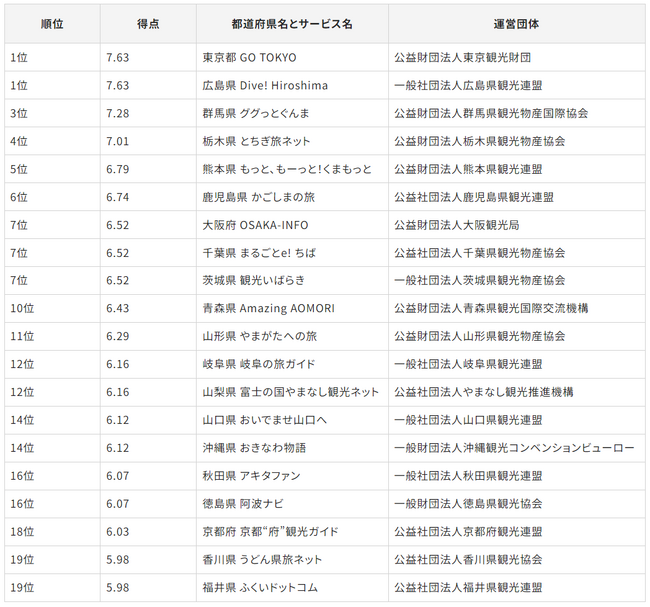 「Gomez 観光情報サイトリライアビリティランキング2023」上位20都道府県は、以下のようになりました。