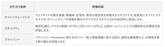 当社のサイトリライアビリティランキングでは、評価に当社独自の基準を設けており、サイトパフォーマンス、セキュリティ、プライバシーの3つのカテゴリに従って、合計45項目で達成度を調査し、重要度を加味した加重平均点数をもとに総合得点を算出します。この結果をもとに、企業や自治体は、効率的かつ安定的にサービス展開や運用を行うためのサービス品質に関する目標・評価基準を定めていただくことができます。