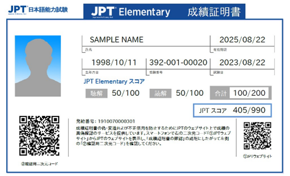 JPTと同様に、法務省出入国在留管理庁より日本語教育機関へ入学する資格として認定されました。成績証明書には、JPT Elementaryのスコアだけではなく、JPTのスコアも併記されます。日本語能力証明が必要な際は、JPT、JPT Elementaryのスコアともにご利用いただけます。