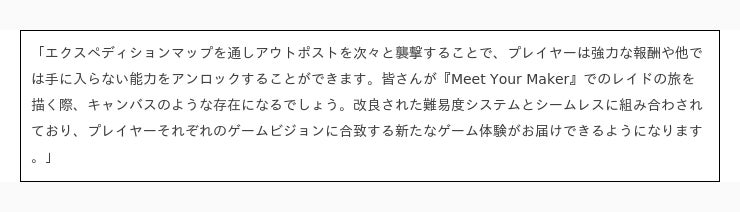 本システムについて、『Meet Your Maker』シニア・クリエイティブ・ディレクターのAsh Pannell(アッシュ・パネル)は以下の様に述べています。