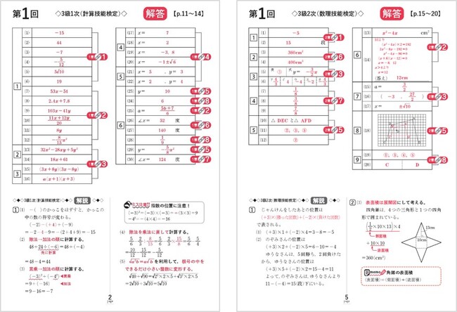数学検定の3~5級は、主に計算力を測る計算技能検定(1次)と、応用力を測る数理技能検定(2次)に分かれています。同じ単元でも1次と2次で問題傾向が異なるため、それぞれのちがいをきちんと理解したうえで本番に臨むことが望ましいです。本書は二部構成になっており、前半で1次の対策、後半で2次の対策、とそれぞれのちがいを意識しながらしっかり対策することができます。