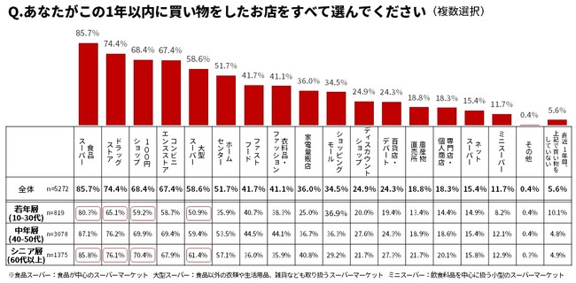 年代別ではトップ5までは順位の変動はないものの、若年層(10~30代)とシニア層(60代以上)を比較してみると、「ドラッグストア」(若年層65.1%、シニア層76.1%)、「100円ショップ」(若年層59.2%、シニア層70.4%)、「大型スーパー」(若年層50.9%、シニア層61.4%)など10ポイント以上の開きがあることから、年代が上がるにつれ様々な種類の店舗で買い物をしていることわかります。