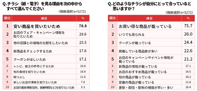 チラシ(紙・電子)を見る理由を聞いてみました。トップは「安い商品を買いたいため」(78.8%)でした。どのようなチラシが自分にとって合っているか?の問いでもトップは「お買い得な商品が載っている」(75.7%)でした。