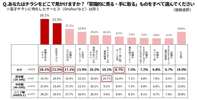 ■意識的に見るチラシ、折込チラシ以外の手段が広がる 店舗入り口、かごの中 若年層ではGoogle検索結果も