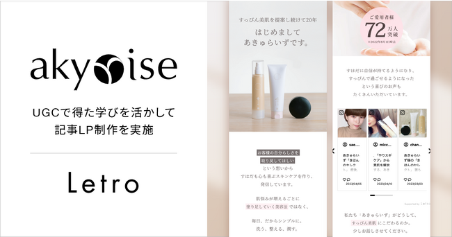 そのような中、記事LPの訴求が一つの勝ちパターンに固定化していた状態から脱却し、獲得効率の抜本的な改善を目指すために、UGCから見えた「お客様の体験価値」をもとに新たな訴求の記事LP制作を検討。そこで、これまでUGC運用を通じて、あきゅらいずの顧客を深く理解し、累計約15万件にも及ぶ新規獲得LPの運用改善を見てきたLetroと共に新たな記事LPを制作するに至りました。