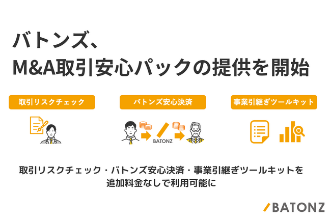 M&A総合支援プラットフォーム「BATONZ(バトンズ)」を運営する株式会社バトンズ(本社:東京都中央区、代表取締役CEO:神瀬悠一、以下バトンズ)は、2023年10月1日より、会社や事業を買収するユーザーが安心して取引ができる「M&A取引安心パック」の提供を開始したことをお知らせします。