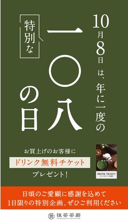 一〇八抹茶茶廊の定番の人気ドリンクを無料で体験できるチケットとなっております。
