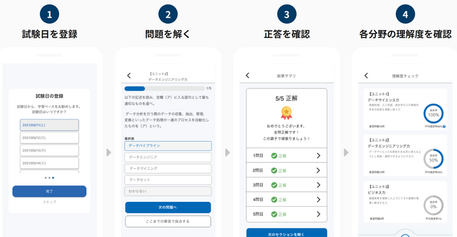 スマートフォンアプリを活用して効率的に学習ができるとともに、試験範囲の中での得意分野や苦手分野の把握、それぞれの学習進捗度がわかるよう学習データが可視化され、利用者を合格に導きます。
