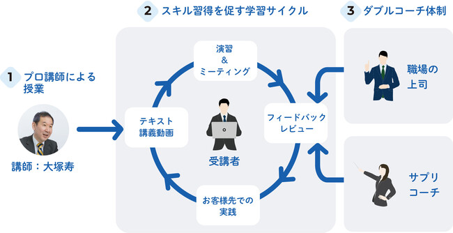 本研修では、テキストや動画で学ぶだけではなく、演習を通して「実践」を積み、さらにコーチが個別指導を行います。 この学ぶ→実践→フィードバックのサイクルは「経験学習サイクル」と呼ばれる学習フレームワークで、主体的な学びを深めるのに有効であるとされています。 また、6ヶ月という期間、現場での実業務と並行で学習を進めることができるため、現場と研修を往復しながら繰り返し学習すことで、現場で役立つスキルの定着につながります。