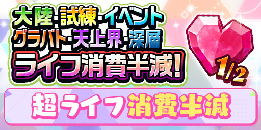 期間中、大陸・試練・イベント・グランバトル・天上界NORMAL・現代大陸深層・アリーナクエストで消費するライフが半減されます。
