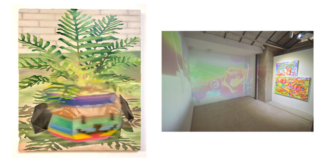 パソコンで描いた絵を作品で扱うにあたって、デジタルにしかない質感、たとえばピクセルという単位で描くことや物理的凹凸がないことに着目した。その絵画的な視点を出発点に、普段見ることのない絵画の制作工程も作品の一部とし、完成という概念を曖昧にしている。