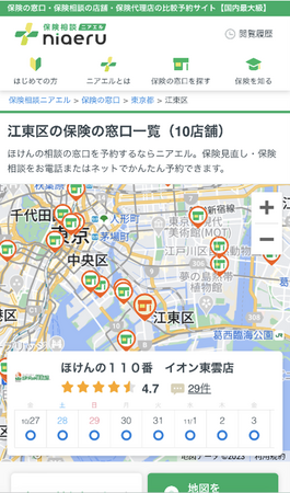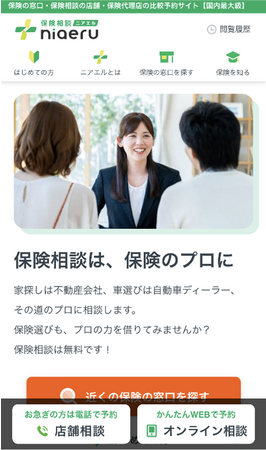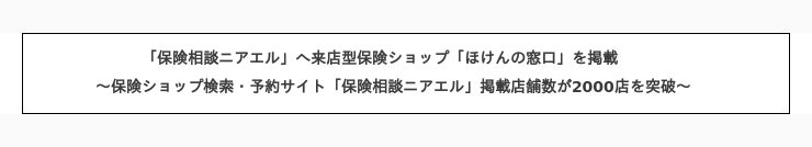 今回の掲載により、保険ショップ検索・予約サイト「保険相談ニアエル」の掲載店舗数は、サービス開始以来、初めて2000店舗を超えました。当社では、今後も、掲載店舗数やお客さまからの口コミ数など店舗情報の更なる充実を通じて、お客さまにとって最適な保険ショップのご紹介に努めてまいります。
