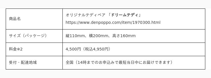 ぬいぐるみ電報「ドリームテディ」は、「でんぽっぽ」に届いたテディベアの電報を贈りたいというお客様の多くの声に応えて販売を決定しました。