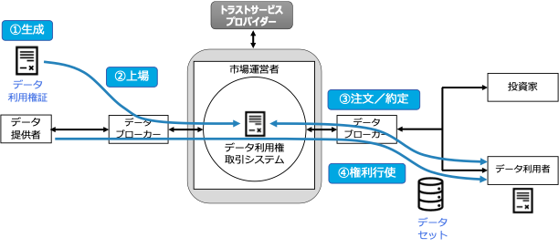 本実証では、データ提供者・データ利用者・データブローカーの各役割を担当する企業や組織を広く一般から募集し、具体的な業態、業務、データの提供・活用を想定してデータ利用権取引市場システムの機能をご利用いただき、1.利用権証の生成、2.上場、3.注文/約定(売買)、4.利用権の行使、といった一連の操作を体感したうえその操作性や活用可能性、課題抽出などの観点で検証していただきます。