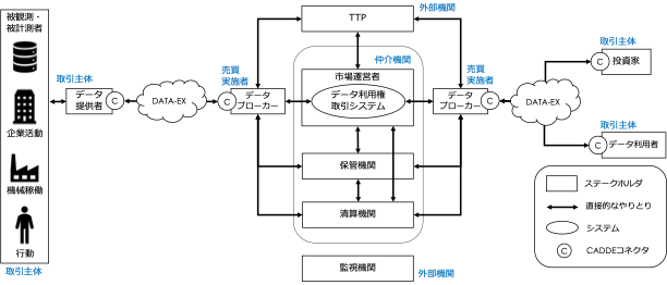 DSAでは、内閣府総合科学技術・イノベーション会議の「戦略的イノベーション創造プログラム(SIP)第2期/ビッグデータ・AIを活用したサイバー空間基盤技術(管理法人:国立研究開発法人 新エネルギー・産業技術総合開発機構)」において研究開発さたれ、分野間データ連携技術(https://sip-cyber-x.jp )の成果を社会実装するため「DATA-EX」の構築に取り組んでいます。DATA-EXは、分野を超えたデータ連携のための基盤として、参加者のデータ主権を確保しながらデータ連携する取り組みですが、これらの連携においてはデータ提供者・利用者間の相対取引だけでなく、強固な契約管理を伴う機能を実現する手法として、外部連携先であるデータ取引市場への接続機能を提供します。今回のデータ利用権を用いた取り組みは、このデータ取引市場の発展的形体として位置付けています。