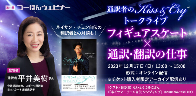 対談形式で、同書の翻訳作業についてや、平井さんが通訳を務めたネイサン・チェン選手の出版記念来日イベントでのエピソードについて、選手の言葉をいかに訳すか、フィギュアスケートの通訳・翻訳の難しさや工夫、やりがいについてなど、「フィギュアと通訳・翻訳」について存分に語っていただきます。