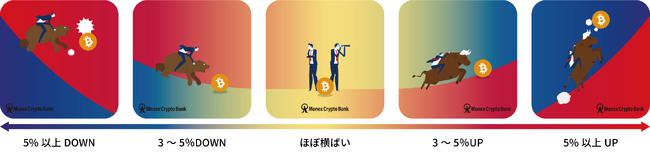 具体的にはビットコインの価格が前日から5%以上UP、3~5%UP、ほぼ横ばい、3~5%DOWN、5%以上DOWNの5段階でブルベア指数をモチーフとした絵柄が変化するDNFTとなっています。