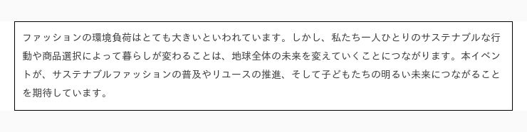 今回のプロジェクトに参画した背景として桜庭氏は「サステナブルなファッションを楽しむというテーマ自体が、そのまま私たちのビジネスであると感じました。サステナブルなファッションを楽しむ人を増やしていくことがティンパンアレイが目指していることでもあるので、このプロジェクトを通じてより多くの方に楽しむ機会を提供したいという思いで賛同させていただきました」とお話しいただきました。