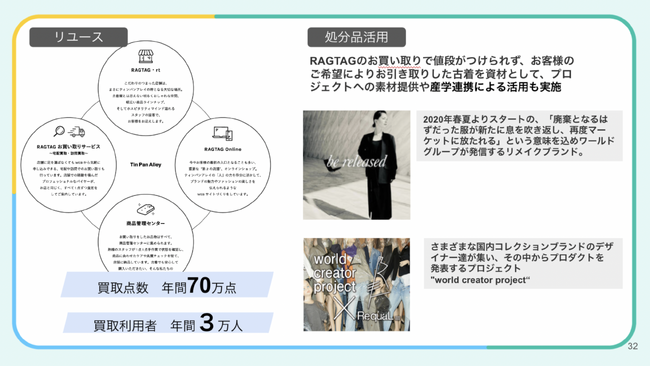 これに加えて、桜庭氏は「お客さまに合意いただいた上で、RAGTAGでお値段がつけられなかった服の引き取りなども行っています」と話し、引き取った服を素材として、新たな服を生み出すリメイクブランド「be released」の展開(※8)や国内コレクションブランドのデザイナーたちが新たなプロダクトを発表する「world creator project」(※9)の実施など、「処分品活用」に関する取り組みを紹介しました。