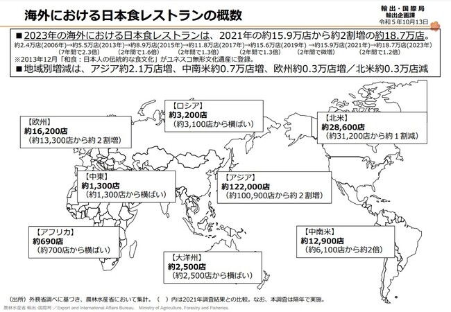 また、海外における日本食の人気も、以下マップの日本食レストラン概数の通り、2021年の約15.9万店から2023年は約2割増の約18.7万店と、日本食の人気が高まっていることがわかります。