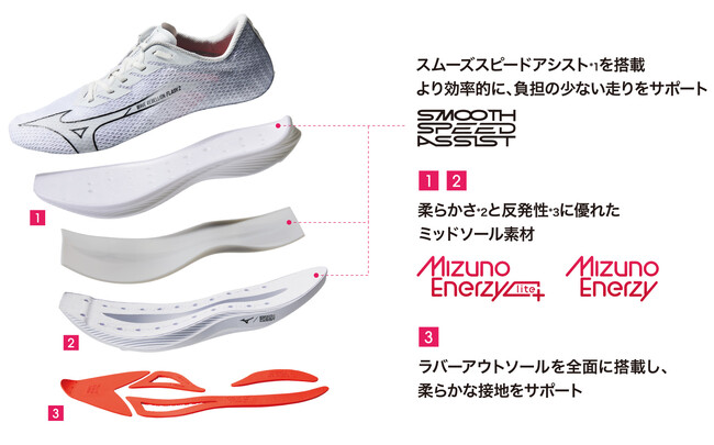 今モデルからソール部の形状に『SMOOTH SPEED ASSIST』を搭載することにより、フォアフット、ミッドフット走法中のふくらはぎ周辺筋肉の負荷を軽減し、レース後半のラストスパートをサポートします。トップミッドソール部は、今モデルから「WAVE REBELLION PRO 2」と同じ素材の『MIZUNO ENERZY LITE+』を採用することでクッション性と反発性が向上しています。また、ボトムミッドソール部はクッション性と反発性がバランスよく発揮される『MIZUNO ENERZY』を採用しています。