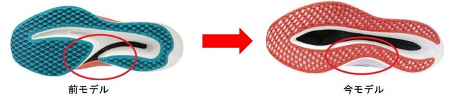 トップミッドソール部は、ミズノ独自の高反発ミッドソール素材『MIZUNO ENERZY LITE+』を前モデルから32%増量し、クッション性と反発性が向上しました。ミッドソール部には、接地面積を向上するためにセパレートから繋ぎ合わせた形状に変更することで、安定感の向上を追求しています(図の赤丸部)。また、ウエーブプレートの形状を変更することで、より反発性がアップしました。