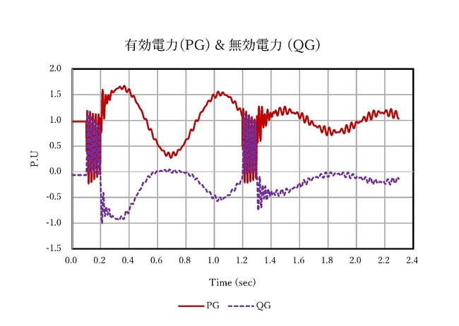 第4章は、発電ユニットの解析を行うため、一機対無限大母線を模擬し、電力系統に事故が発生した場合の現象について、3章の軸トルクだけでなく電気的な要素も加えて計算している。(添付図参照)