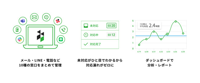 メール、電話、チャット、LINEなど多様化するコミュニケーションサービスを一つの画面に集約し、顧客との接点が増え複雑になった問い合わせを簡単に一元管理できます。さらに、二重返信や対応漏れを防止するステータス管理やWチェックが簡単にできる承認機能など、複数人での問い合わせ対応で生じがちな様々な課題を解決する機能を備えています。
