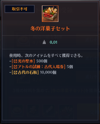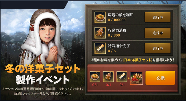 イベント期間中、ミッションをクリアするとイベントページより「りんごパイ」「ジンジャークッキー」「焼きマシュマロ」を獲得できます。獲得したアイテムは、イベントページにて「交換」ボタンをタップすると「冬の洋菓子セット」と交換することができます。
