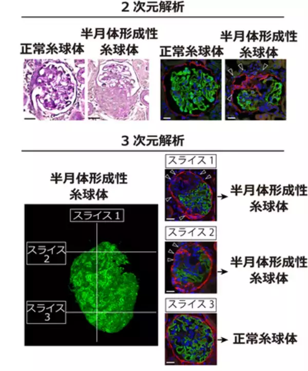 2.→ラットの半月体形成性糸球体腎炎モデル(注5)に対して、2次元での解析と組織の透明化を用いた3次元での解析を比較しました(図3)。その結果、3次元で解析すればスライス1,2,3を含めて糸球体全体を解析するので、半月体形成性糸球体と確実に診断できますが、一方で旧来の2次元でスライス3のみを解析した場合には、正常糸球体と誤って診断する可能性があり、3次元で解析した方が病変の見逃しを防げることがわかりました。