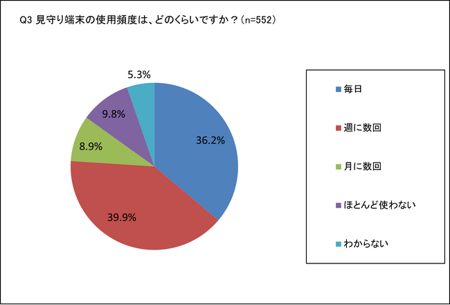 見守り端末の使用頻度を聞くと、「毎日」(36.2%)。「週に数回」(39.9%)、「月に数回」(8.9%)、「ほとんど使わない」(9.8%)など、全体の6割以上が見守り端末を毎日使っていない現状が明らかになった。