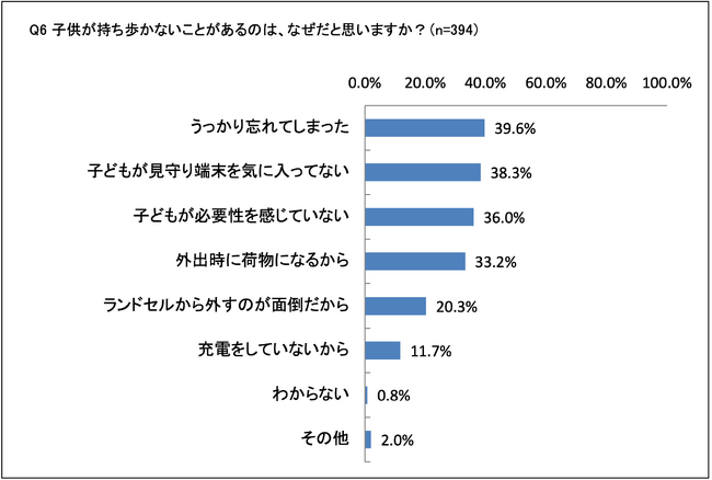 5.子どもが見守り端末を持ち歩かないことがある理由としては、「うっかり忘れてしまった」(39.6%)が最多。「子どもが見守り端末を気に入ってない」(38.3%)、「子どもが必要性を感じていない」(36.0%)など、見守り端末に対する子どもの関心が低い傾向