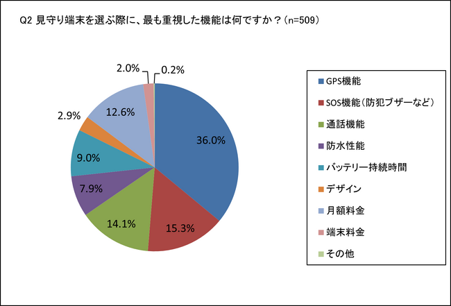 2.見守り端末を選ぶ際に最も重視した機能、「GPS機能」(36.0%)が首位。