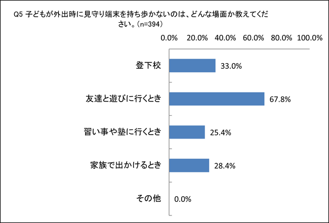7割以上が子どもが外出時に見守り端末を持ち歩かないことがあると回答。持ち歩かないことがある場面の最多は「友達と遊びに行くとき」(67.8%)、次いで「登下校」(33.0%)