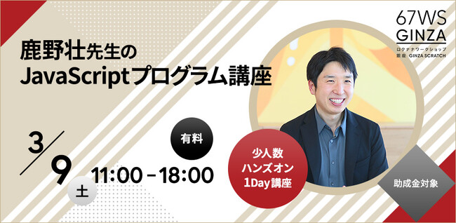 株式会社FIVESTARinteractive(本社:東京都中央区、代表:木村 省悟)は2024年3月9日(土曜日)にスタートアップスタジオGINZA SCRATCHにて、ロクナナワークショップ銀座「鹿野壮 のJavaScriptプログラム講座」を開講いたします。講師に 鹿野壮 氏を迎え、JavaScriptプログラムをハンズオントレーニング形式で学びます。