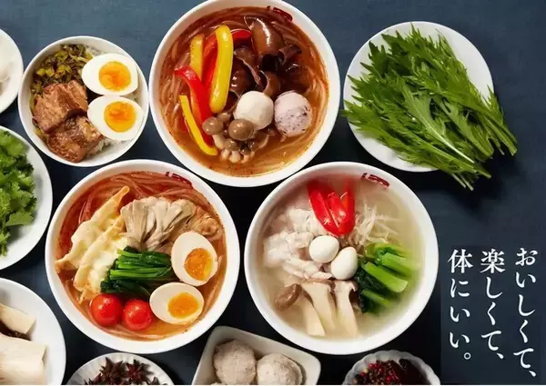 七宝麻辣湯では、30種類以上の薬膳スパイスと、鶏や豚のコラーゲンをたっぷり含んだスープを毎日店舗ごとに丹念に仕込んでいます。春雨は鹿児島県産さつまいもと北海道じゃがいもを配合し、スープに合った麺の太さや食感を追求しました。トッピングには食物繊維豊富な野菜を取り揃えています。七宝麻辣湯の薬膳スープ春雨「麻辣湯」は、美味しさはもちろん、好きなトッピングや辛さを選ぶ楽しさ、気軽さを兼ね備えたヘルシーフードです。