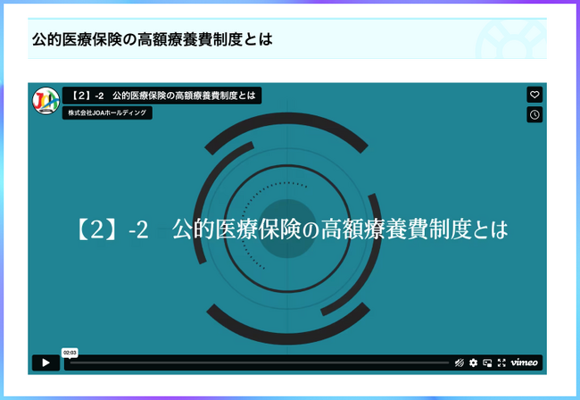 メールではなく対面で説明を行う場合も、直接お客様に動画を視聴頂く事で理解を深めて頂くような使い方も可能です。また募集人が動画を閲覧する事で、公的保険の知識を容易に身につける事も出来ますので、募集人の学習効率を上げ、公的保険の説明品質の統一を図る事が出来ます。