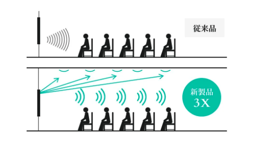 本体上部に配置されたスピーカーは、天井の反射を利用して同じ音声出力でもより遠くまで音を届けることができます。また、マイクの数を増やし、集音声が大きく向上し、教室の雑音を低減しながら発言者の音声をしっかりと集音できます。