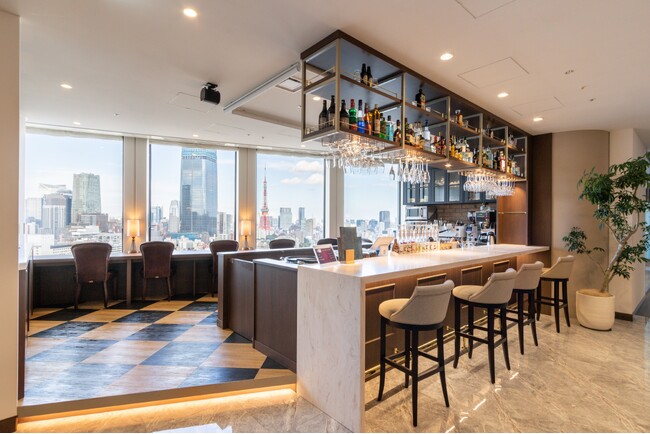 重厚感のある大理石のカウンターと落ち着いたゴールドの素材感を組み合わせ、華やかなレセプションを演出。日本の文化を感じられる和室も配置。また、コミュニケーションの場として、アイランド型のバーカウンターを用意しています。メタリック調のタイルは光を反射し、夜の美しい夜景をさらに煌びやかに演出します。