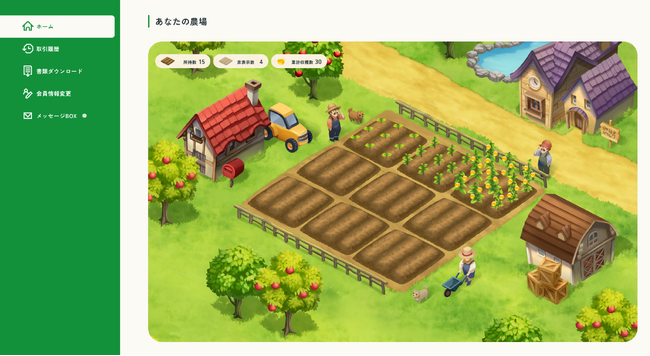また、トークンを買うことで、お金を育てるファームのデジタルオーナーとなることができ、マイページ上の自分の敷地にトークン(ファーム)が゙配置されます。「お金」の収穫時期が近付くにつれ農場も成長していきますので、 自分だけの敷地にたくさんの農場で「お金」を育てる感覚を楽しみながら資産運用ができる新しい体験を提供いたします。