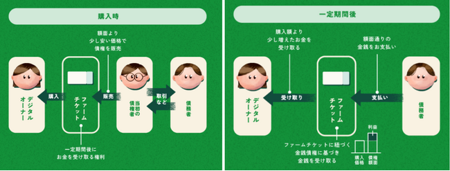 Money Farmでは、ファームチケットという形で、一定期間後に金銭を受け取ることができる権利(金銭債権)をトークン化(※)した商品が販売されます。