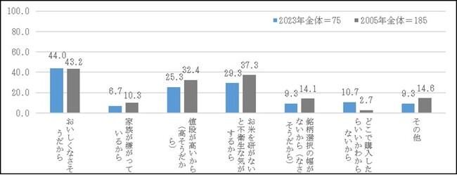 無洗米を今後も購入したくない人に理由を聞いたところ、「おいしくなさそうだから」44.0%が2005年調査と同様に最も高い結果となった。次いで、「お米を研がないと不衛生な気がするから」29.3%、「値段が高いから(高そうだから)」25.3%であり、この2項目は2005年調査より低下している。