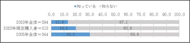 無洗米認知者に無洗米の製造方法を知っているか聞いたところ、認知者は12.9%に留まる結果となった。2005年調査と同様に無洗米を現在購入している人に絞っても、製造方法の認知者は19.2%であり、2005年調査と比べ認知者は減少している。